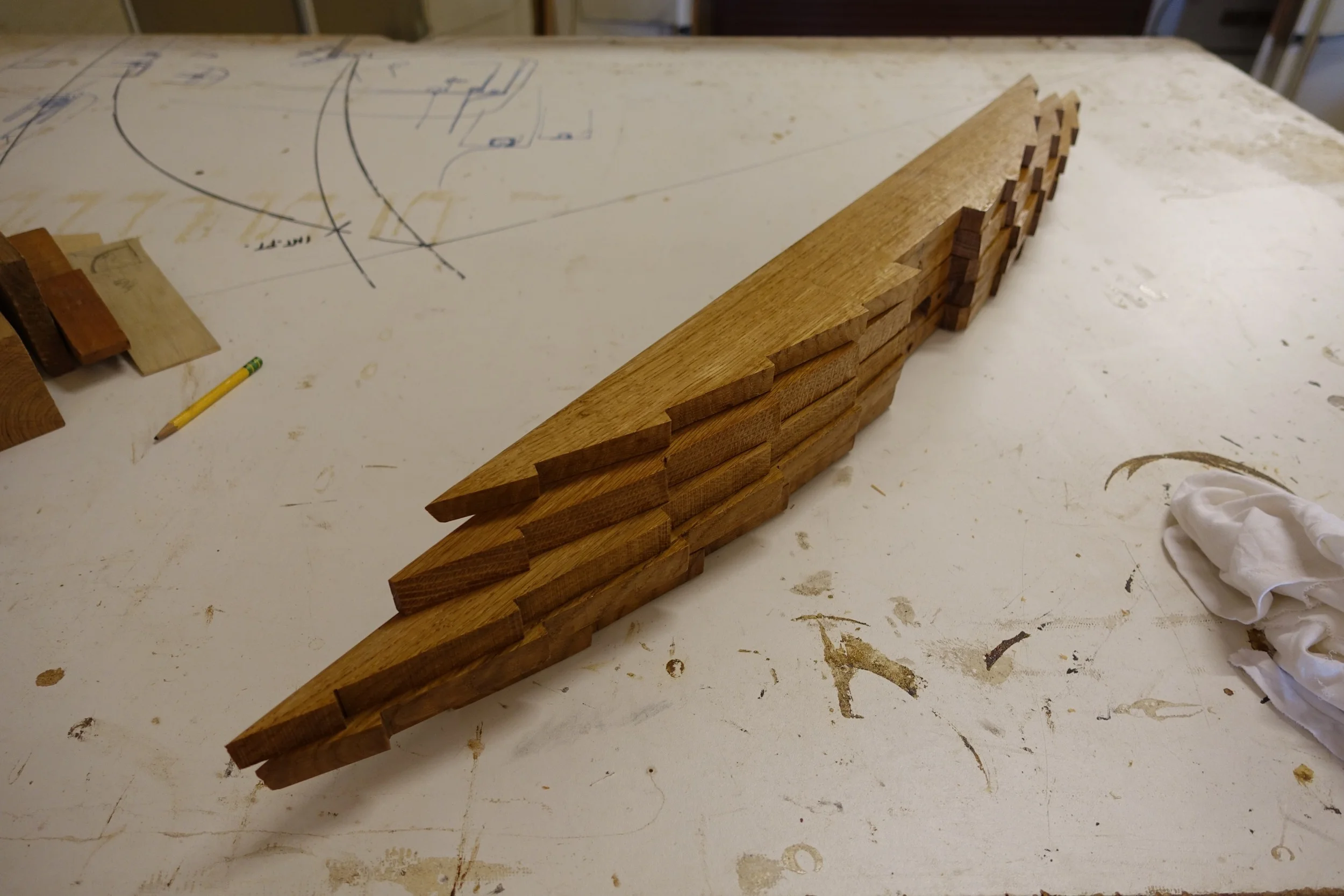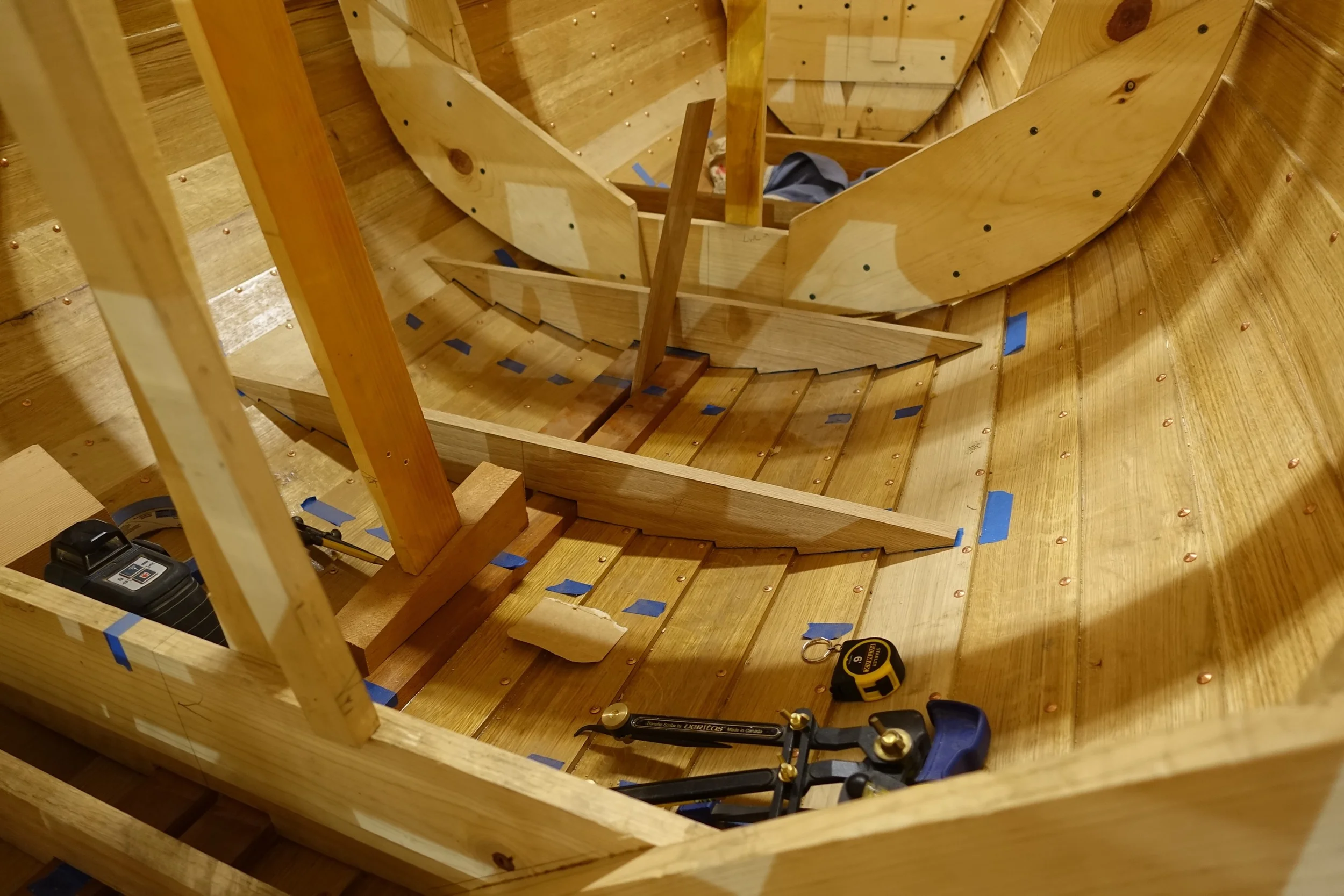 After several coats of varnish, the planking is ready for me to start mounting things onto it. First are the floor timbers, the shape is lifted directly from the lofting, and then scribed or spiled to fit the laps. After I am happy with the fit, I cut the limber holes. The floors are then sanded and pre-finished, then I install them with bedding compound and screws. The floor timbers are essential to the wooden hull, and serve several duties: holding the two halves of the boat together, stiffening the bilges, and supporting the sole boards.